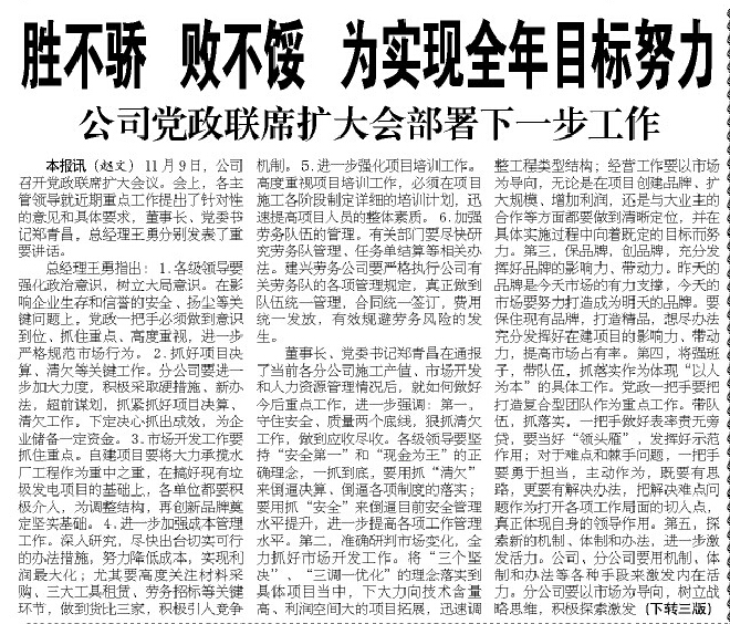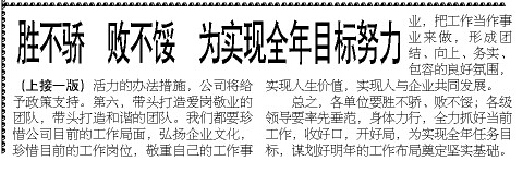 公司2013年四季度最佳文章评选结果揭晓#Black 来源: 修改时间:2014.06.13 浏览:3823 公司2013年四季度最佳文章评选结果揭晓 根据各单位报送的评选结果并经公司评委会认真研究,2013年四季度《河北二建》和公司官方网站最佳文章是:2013年11月15日《河北二建》一版刊登的《胜不骄败不馁为实现全年目标努力》,作者:赵文,单位:公司机关。 上一条 返回列表 下一条