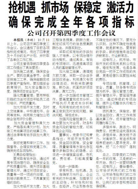 公司2014年10月份最佳文章评选结果揭晓 来源: 修改时间:2014.12.15 浏览:3563 公司2014年10月份最佳文章评选结果揭晓 根据各单位报送的评选结果并经公司评委会认真研究,2014年10月份《河北二建》和公司官方网站最佳文章是:2014年10月15日《河北二建》一版刊登的《抢机遇 抓市场 保稳定 激活力 确保完成全年各项指标——公司召开第四季度工作会议》,作者:李聪,单位:公司机关。 上一条 返回列表 下一条