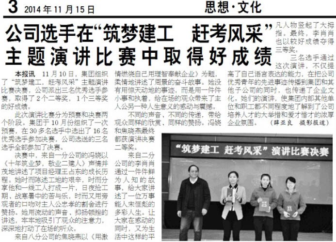公司2014年四季度最佳文章评选结果揭晓 来源: 修改时间:2015.05.04 浏览:3450 公司2014年四季度最佳文章评选结果揭晓 根据各单位报送的评选结果并经公司评委会认真研究,2014年四季度《河北二建》和公司官方网站最佳文章是:2014年11月15日《河北二建》三版刊登的《公司选手在“筑梦建工 赶考风采”主题演讲比赛中取得好成绩》,作者:薛亚良,单位:公司机关。 上一条 返回列表 下一条