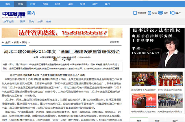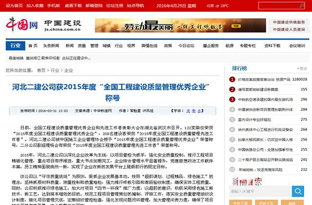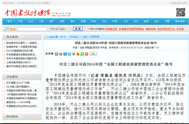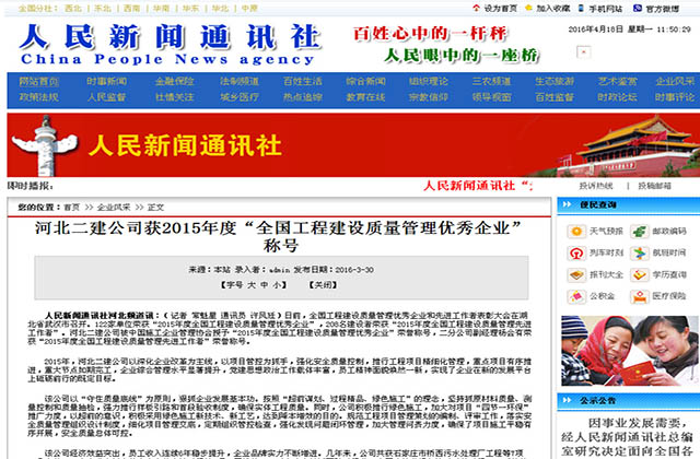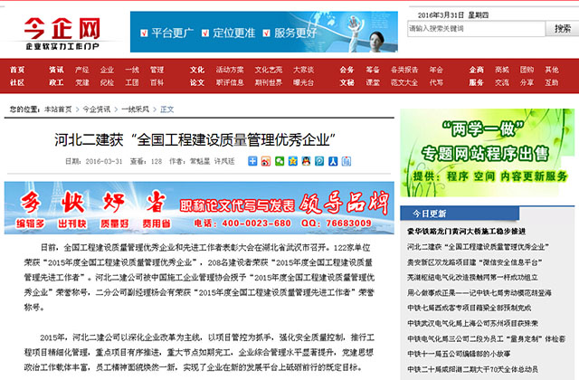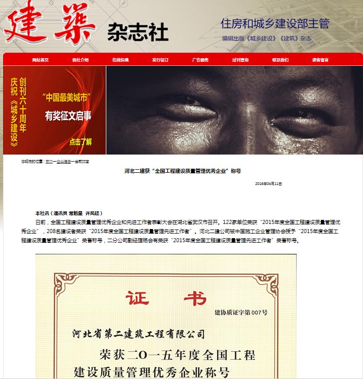 2016年3月16—18日,全国工程建设质量管理优秀企业和先进工作者表彰大会在湖北省武汉市召开。公司被中国施工企业管理协会授予“2015年度全国工程建设质量管理优秀企业”荣誉称号,二分公司副经理杨会有荣获“2015年度全国工程建设质量管理先进工作者”荣誉称号。