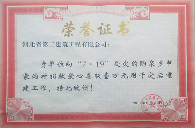 8月23日,邯郸市磁县住房和城乡建设局领导对河北二建公司职工的无私奉献精神给予了高度赞扬,并颁发了捐款荣誉证书。