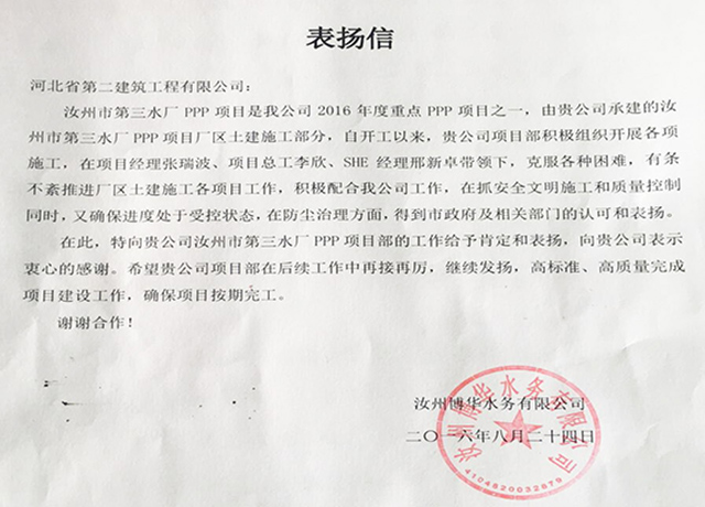六分公司 河南汝州水厂项目受到甲方表扬 来源: 修改时间:2016.09.14 浏览:5252 六分公司河南汝州水厂项目受到甲方表扬 近日,业主将一封表扬信送到六分公司汝州第三水厂PPP项目部,该项目全体职工倍受鼓舞。该工程位于河南省汝州市,水厂厂区建设规模6万吨/d,工期240日历天。项目人员经过两个半月的努力,已完成工程总任务量的42%,该工程最大清水池于近期封顶,吸水井已完工,泵房达到±0,其他房号底板已完成。(曹艳玲) 上一条 返回列表 下一条