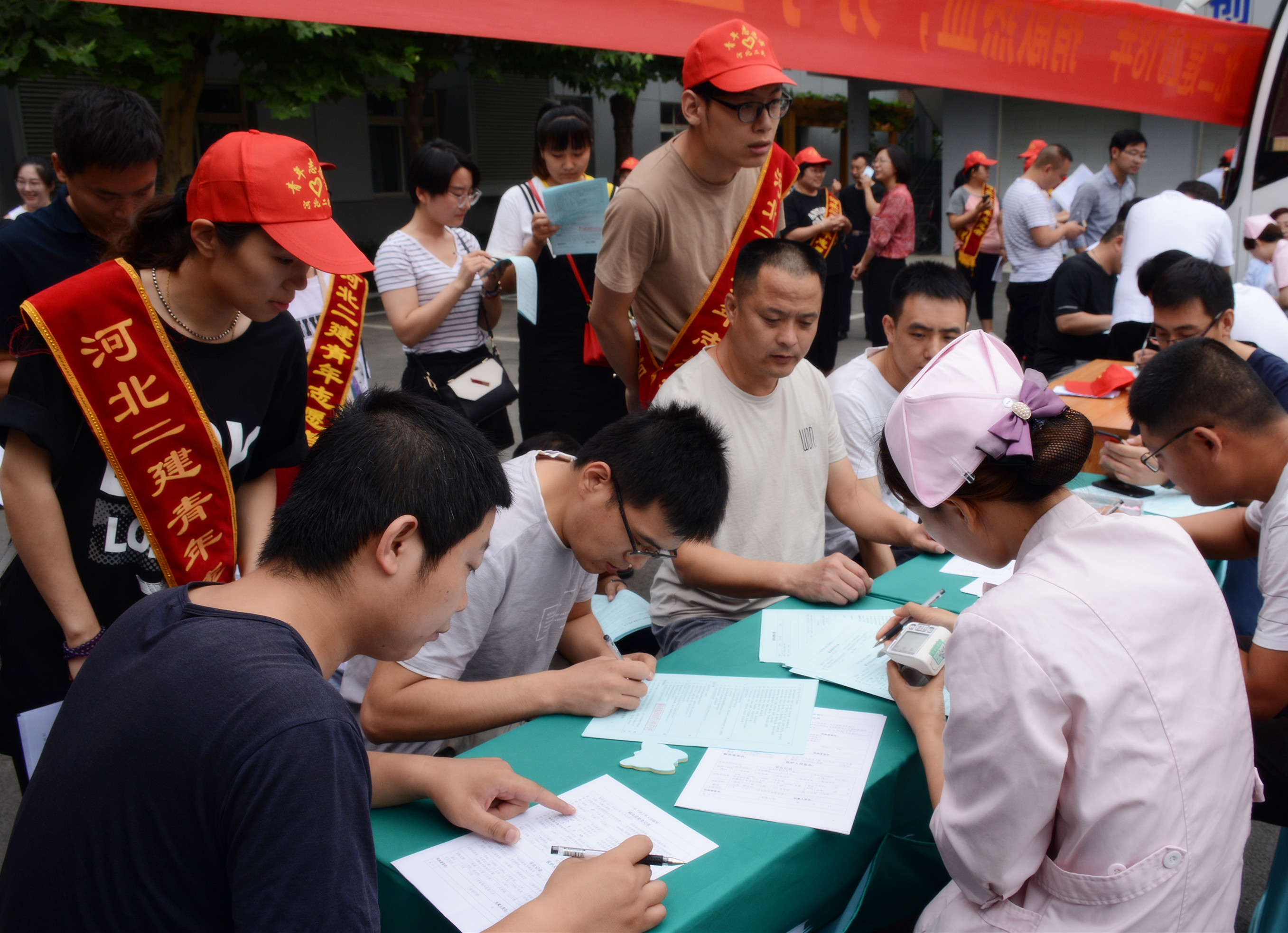 为保证献血活动有序进行,党工部招募了21名志愿者,他们身披“河北二建志愿者”绶带,头戴“河北二建志愿者”小红帽,不到八点就来到公司机关大院忙碌起来,搬桌子、椅子和饮用水,挂条幅、贴车号。上午8:30献血活动正式开始,从登记信息、测量血压、检验血液到献血,都在志愿者的热情配合下井然有序地进行着。