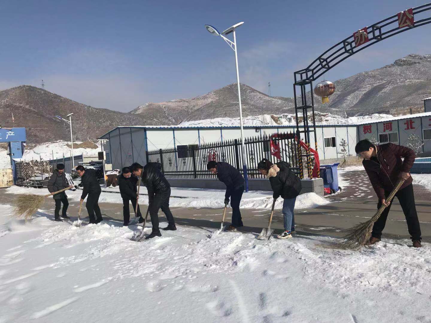上午8点,大家集合完毕,领好工具,正式开始积雪清理工作。大家拿着扫把、铁锹,按照“先内后外、先重点后一般”的工作顺序有条不紊地铲雪、扫雪、运雪,干劲十足,充分发挥团队合作精神,大大提高了积雪的清扫速度。在大家通力合作下,经过两个多小时的奋战,施工场区道路以及附近主干道积雪被全部清除,保证了道路通行安全。