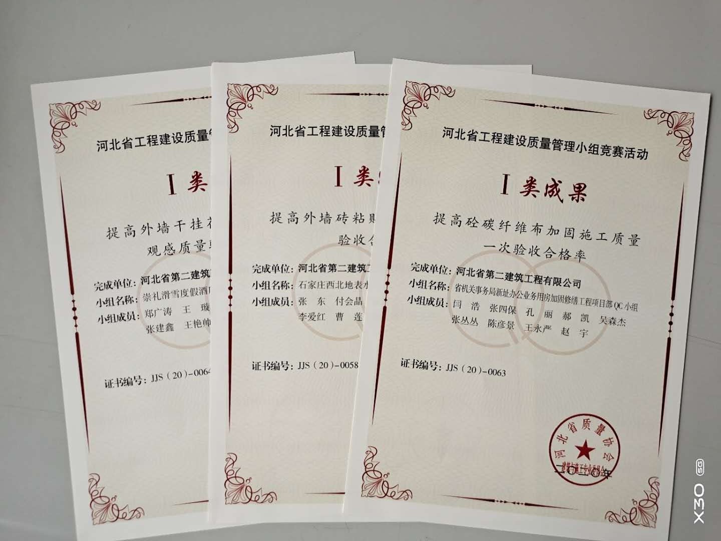 在2020年河北省工程建设质量管理小组竞赛活动中,一分公司共申报3项QC成果,经过专家评审,全部被评为Ⅰ类成果。这3项成果分别为:石家庄西北地表水厂QC小组《提高外墙砖粘贴施工质量一次验收合格率》、省机关事务局新址办公业务用房加固修缮工程项目部QC小组《提高砼碳纤维布加固施工质量一次验收合格率》和崇礼滑雪度假酒店项目QC小组《提高外墙干挂花岗岩石材幕墙观感质量验收合格率》。