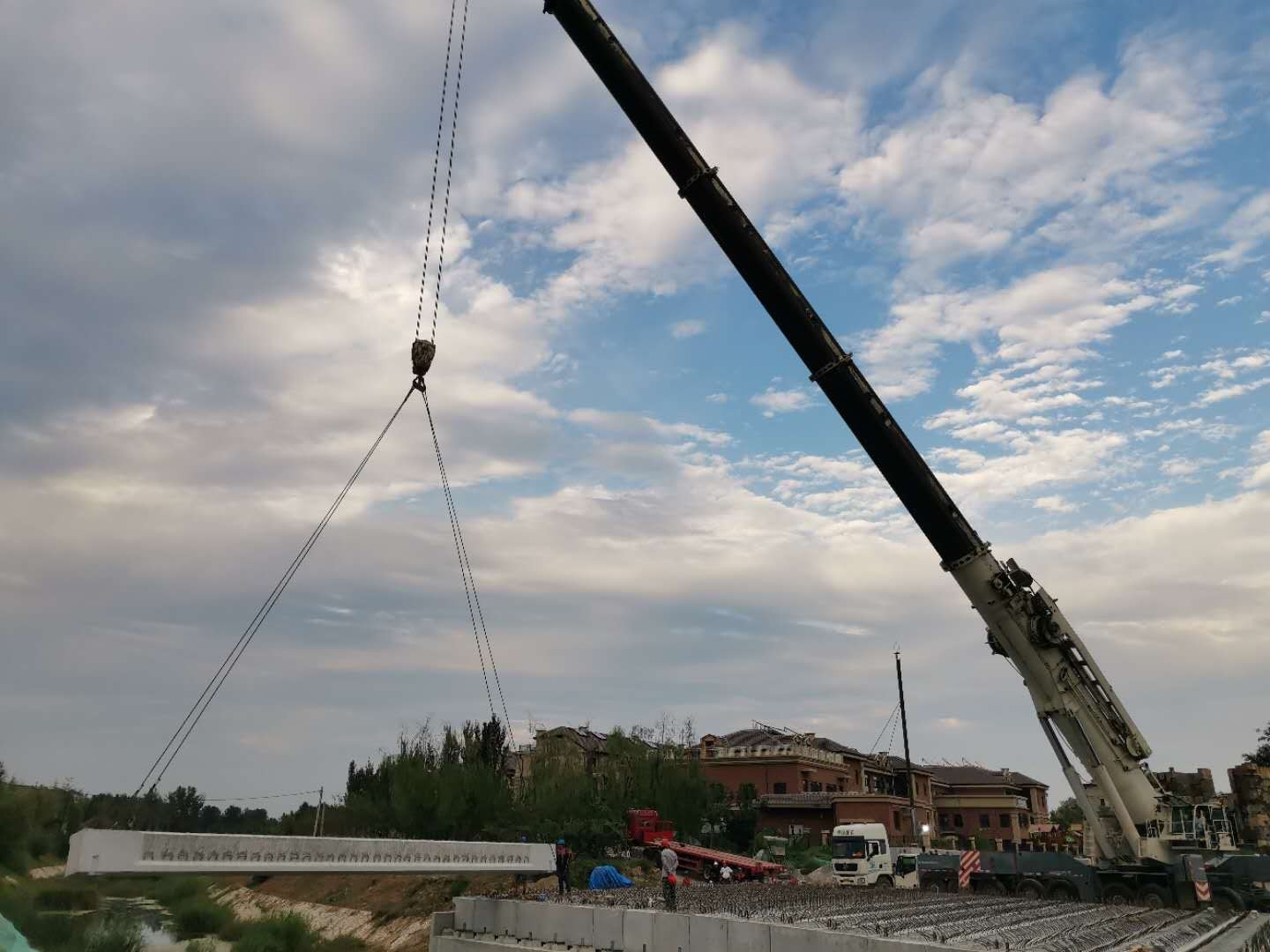 新民桥工程是整个标段重难点控制性工程,此次新民桥全长36米,宽24米,梁体高1米,距离河底5米,共需吊装38块空心板,空心板长度分为16米和20米,重量分别为28吨和36吨,吊装采用500吨汽车吊,按顺序进行吊装。
