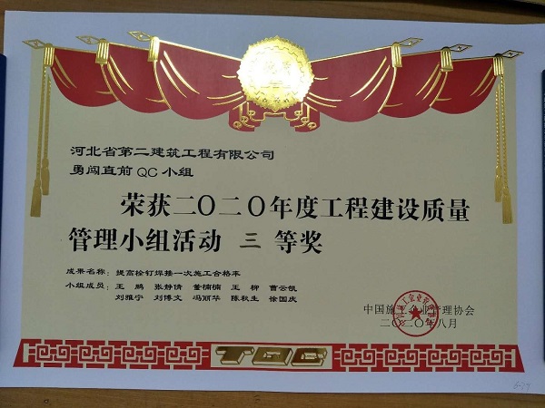针对此次质量管理小组成果发布交流活动,分公司年初就制定了科技进步计划,将渤海新区装配制造园项目定为活动现场,并选择课题《提高栓钉焊接一次施工合格率》,此次课题具有“小、实、活、新”特点,依据PDCA循环,合理运用QC统计工具和方法,完全符合QC活动的程序。经过成果发表人员精心准备和紧张激烈的演讲比赛,最后通过了大会组委会专家评审团的最终评审,课题《提高栓钉焊接一次施工合格率》在发布会上被评定为三等奖。(张静倩)