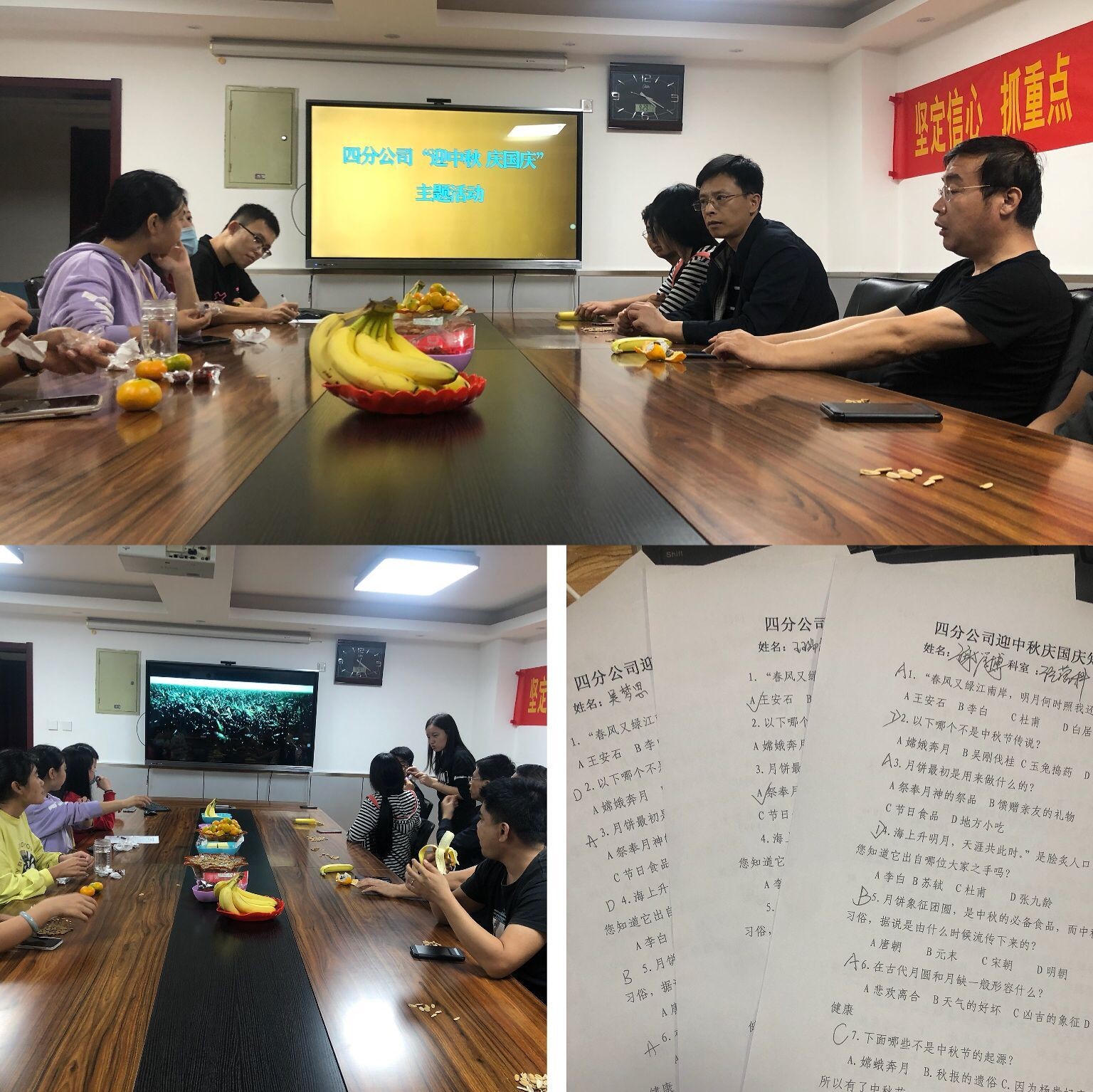 在“中秋节、国庆节”即将来临之际,9月29日下午,四分公司工会组织机关职工开展“迎中秋 庆国庆”知识答题、观看红色电影《八佰》等系列活动,此次活动由分公司工会主席、主任会计师马晓东主持,分公司科室在石职工共计20人参加。
