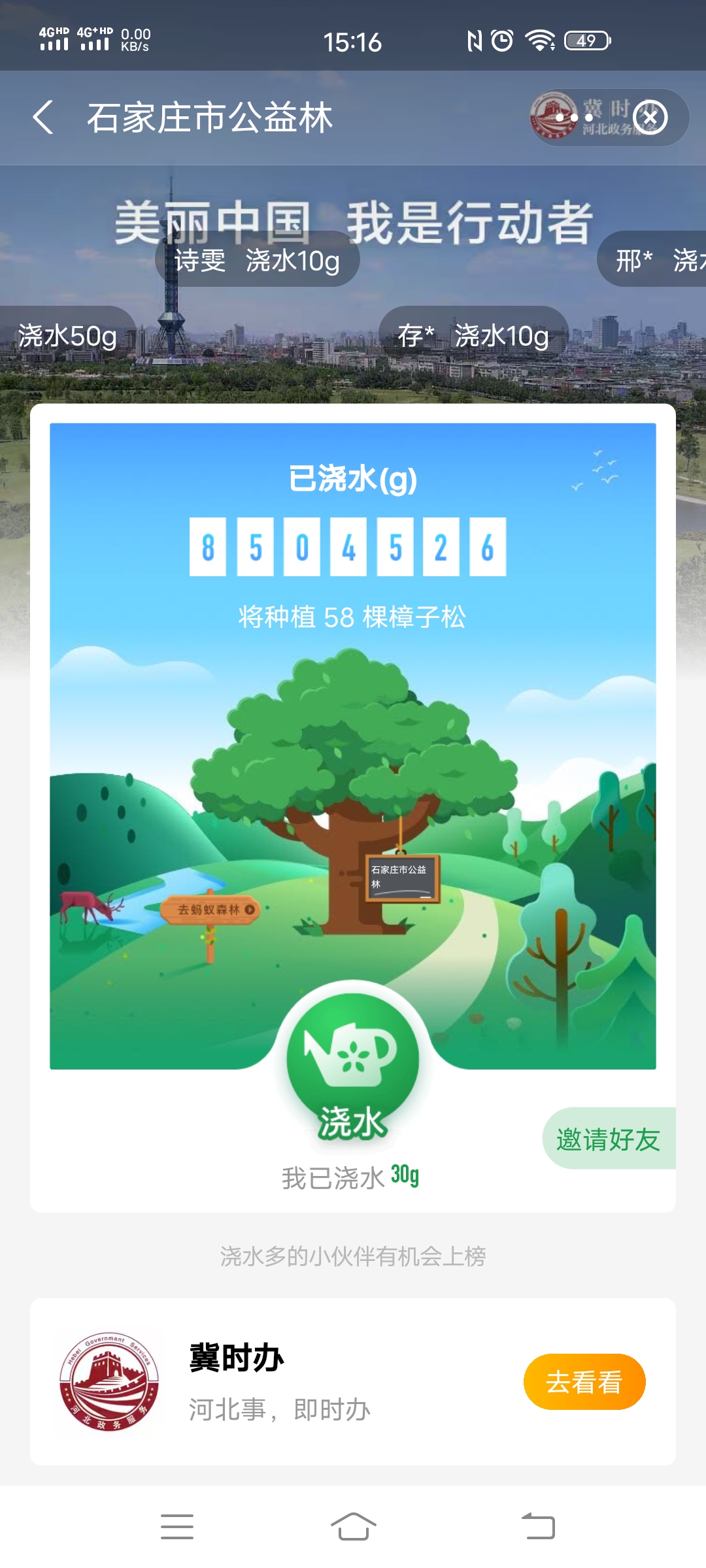 在疫情防控常态化阶段下,分公司团总支解锁了植树节“新玩法”——线上云种树,将植树活动从线下带到了线上,从山间走到了“云上”。通过分公司团总支微信群发出倡议,召团员青年在“蚂蚁森林”上“云植树”为石家庄市公益林浇水,团青们浇下的每一份能量,都会为石家庄市公益林做出贡献,在沙漠深处,团青们捐献的能量值都会变成旺盛的樟子松、梭梭树、胡杨等。