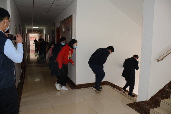 培训完之后,所有人员在高教官的指导下进行了办公楼火灾逃生及疏散演练。演练中大家不慌不乱,弯腰沿着楼道顺利的跑出办公楼。演习让大家掌握了逃生应遵循的基本原则:尽量弯腰低姿,避免吸入火场有害烟气,以湿毛巾捂住口鼻,也可用防毒面罩等等。