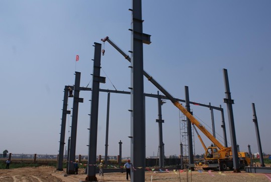 九日上午风和日丽天空晴朗,工人们一早就为屋面梁的吊装紧张的忙碌着。屋面梁安装是钢构车间最复杂也最重要的一道工序,它的安装标志着工程进行到了一个关键的节点,具有重要意义。马凤山厂长、张西坤书记等一行九人按时赶到现场,对已经安装好的钢柱进行了查看和询问,项目经理田朝辉对业主提出的问题进行了仔细回答。当看到独立基础二次灌浆部位干净的表面和四周的成品保护,业主对项目部的工作给予肯定和称赞。十点整吊装工作准备完毕,项目工长郭西彦请示铰接合拢,随着马厂长一声大梁合拢口令,工人们迅速拧紧了高强螺栓,掌声响起,鞭炮齐鸣,第一道大梁圆满合拢。