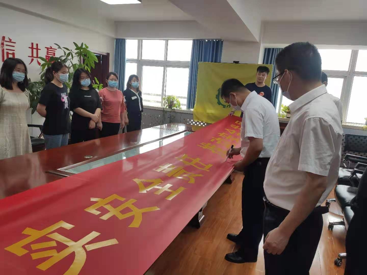 在分公司机关与王集项目上,安全管理科科长周景、项目安全师冯俊国分别带领大家面向安全生产旗高举右手,紧握右拳郑重宣读誓词:我是河北二建员工,安全生产是我的职责……宣誓完毕后,大家在安全条幅上签下自己的名字,代表着自己以身作则的承诺。