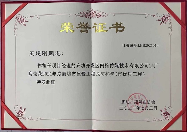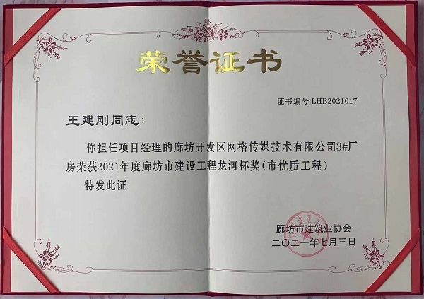 近日,三分公司收到廊坊市建筑业协会颁发的两份荣誉证书,由河北二建承建的廊坊开发区网格传媒技术有限公司1#、3#厂房工程同时获2021年度廊坊市建设工程“龙河杯”奖(市优质工程)。