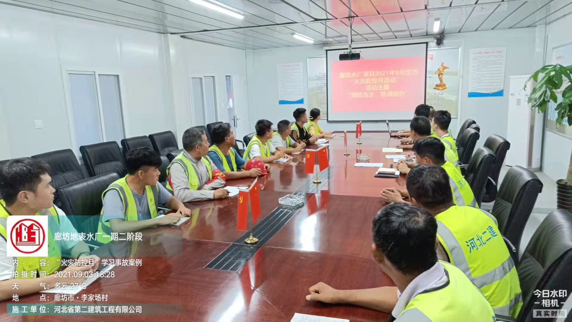 为严格落实公司“一月一主题”活动,四分公司廊坊水厂项目将9月份活动主题为“预防为主,防消结合”,9月3日,廊坊水厂项目经理董云鹏组织项目部全体职工利用晚上的时间观看学习火灾警示教育片。