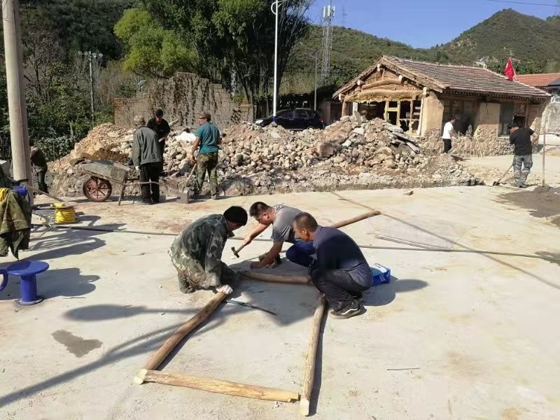板铺村地处南山区,每年十月底就会出现霜冻,此时正值施工的黄金时节,公司驻板铺村工作队和村干部趁着这个好时机抓紧动工建设。为确保该惠民工程顺利进行,驻村工作队和村干部、党员代表、村民代表在建设前多次召开会议,共同商议建设事宜,决定将原大队部西侧的四间旧房拆除,并在村里建起一支施工队伍,从建档立卡户和村民中挑选施工人员,为他们增收提供机会。经过大家的共同努力,最终与原房主达成协议,将原来的四间旧房收回,归村集体所有,同时组建起了一支施工队伍。