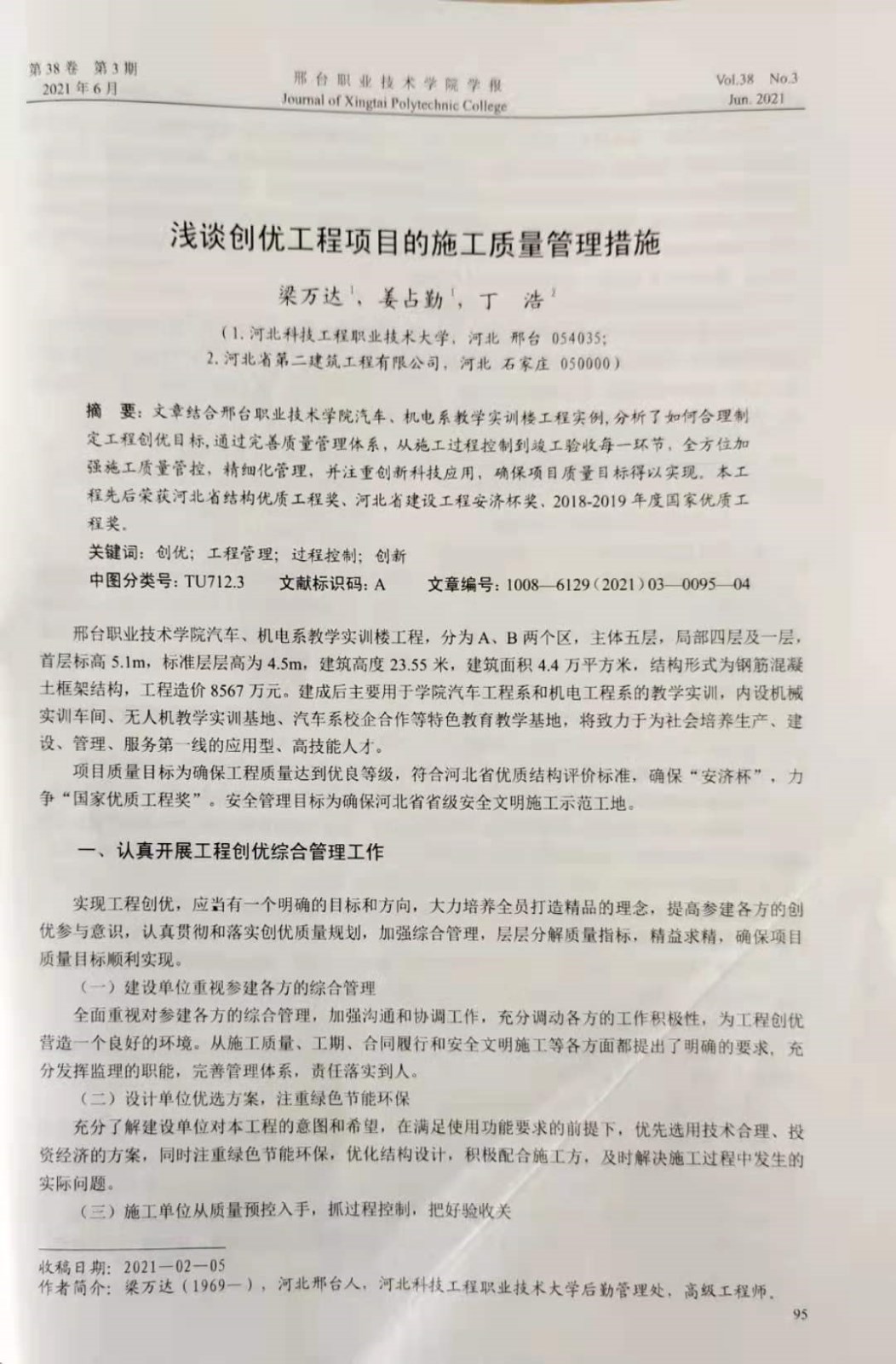 近期,从《邢台职业技术学院学报》获悉,四分公司优秀案例《浅谈创优工程项目的施工质量管理措施》工程技术与应用被《邢台职业技术学院学报》收录。