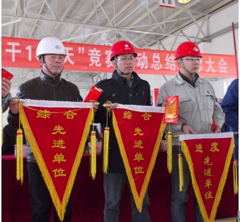 近日,鄂尔多斯市国泰化工有限公司和惠生工程(中国)有限公司国泰项目部召开了“大干100天”劳动竞赛活动总结表彰大会,相关领导出席了大会并为受表彰的单位及个人颁发了锦旗和奖金,河北二建国泰项目在安全、进度、质量等方面表现突出,获得了“综合先进单位”、质量先进班组和HSE先进班组三项荣誉,并分别获得46000元、4000元和2000元奖金,同时对优秀个人进行了奖励:授予李亮优秀项目经理称号,授予赵建普优秀总工程师称号,授予杨常亮优秀HSE经理称号,授予齐庚业、张国宁和徐永祥优秀管理人员称号,同时对11名工人分别给予了200元的奖励。
