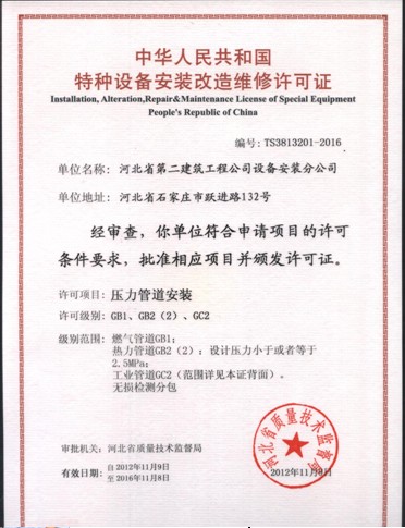 设备安装分公司压力管道安装许可证