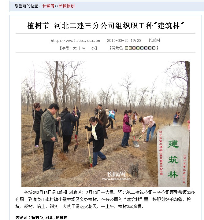 长城网报道我公司种植“建筑林”#Black 来源: 修改时间:2013.04.08 浏览:7012 长城网报道我公司种植“建筑林” 2013年3月13日,长城网长城原创栏目以《植树节河北二建三分公司组织职工种"建筑林"》为题,报道我公司义务植树情况和建造自己的特色林“建筑林”情况。 以下是引用片段: 上一条 返回列表 下一条