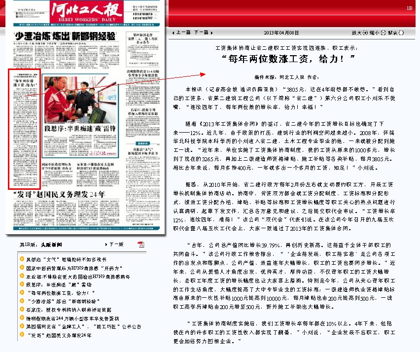 《河北工人报》头版报道我职工工资四连涨#Black 来源: 修改时间:2013.04.08 浏览:7104 《河北工人报》头版报道公司职工工资四连涨 2013年4月8日,《河北工人报》头版以《工资集体协商让省二建职工工资实现四连涨》为题,报道我公司四年来,实行工资集体协商的最大实惠和最有力效果是,让职工共享企业发展成果,让职工工资实现四连涨。 以下是引用片段: 上一条 返回列表 下一条
